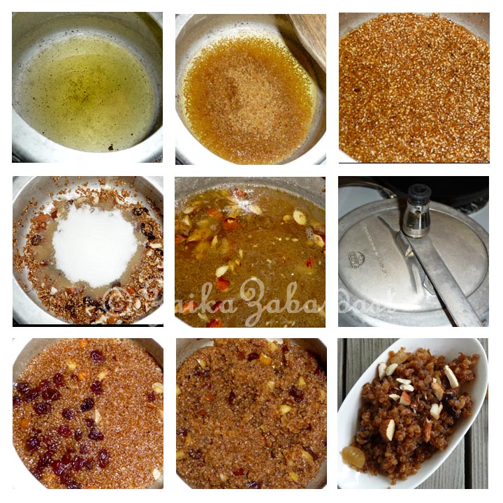 Normally Lapsi is cooked in a Pan with water/jaggery or milk/sugar. This requires your full attention. But I prefer the way my mom makes it which is Pressure cooking Fada with Water and Sugar combination.