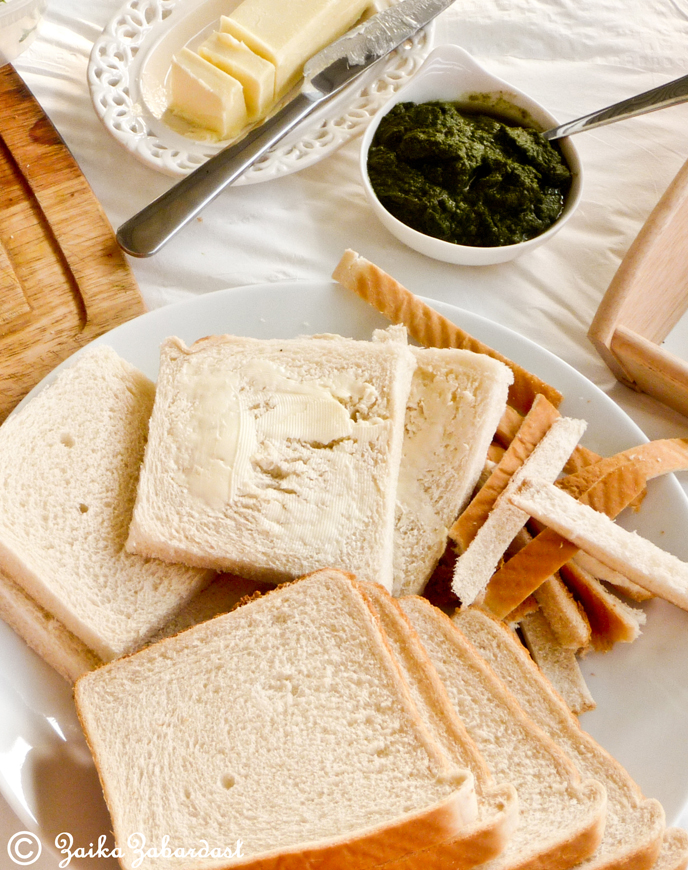 Cut sides of the bread slices and hold on do not throw them you can use them to make bread crumbs or even put them in your mint pesto. Take one bread slice and spread some butter and on the top of it spread some freshly ground mint pesto/chutney. (It is important to apply butter evenly since you do not want your bread to soak all the extra water from the pesto).