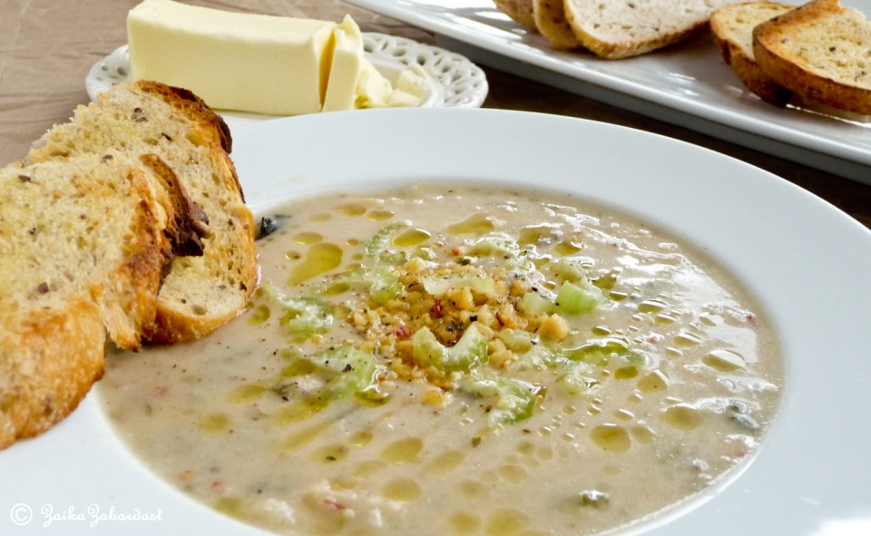 In a large pot, heat EVOO and butter over low heat. Add chopped shallots and ½ tsp of salt to it. Sauté for 5 minutes on medium heat. After 5 minutes add chopped celery and cook for few more minutes. Stir often, until tender, about 5 minutes. Now add chopped potatoes, cauliflower florets, 1/4 cup of parsley, Italian seasoning and cream of mushroom soup along with 2 cups of water. Mix well, cover and simmer gently on medium-low until the vegetables are tender, about 20 minutes. Now partially mash them using your potato masher. (And if you like smooth soup you can even blend it with hand-held blender/mixer). I like chunky soups!!