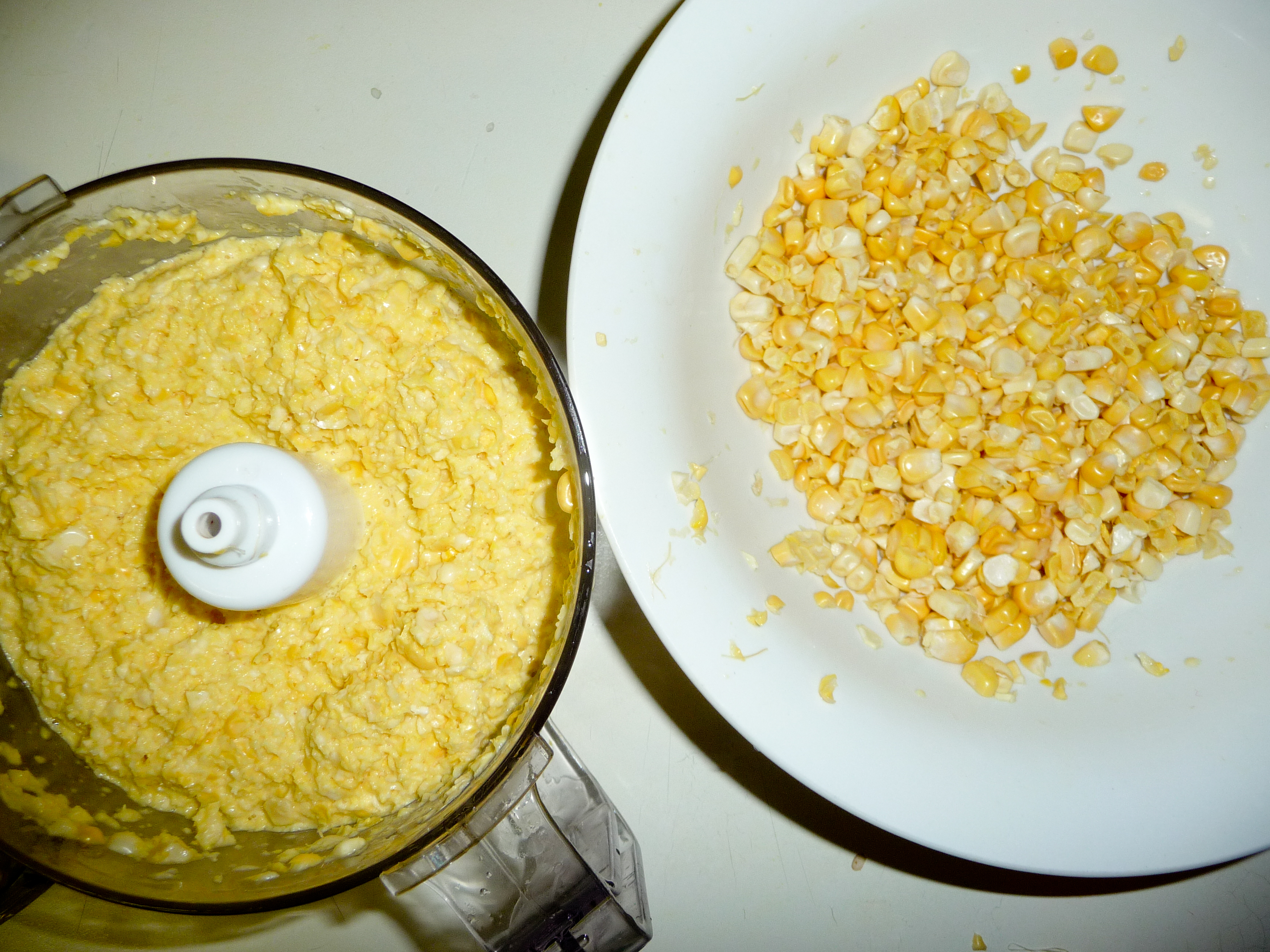 - Remove corn kernels from the cob using your knife. Leave out about ¼ cup of kernels and pulse the rest of it in a food processor few times so that it resembles a coarse mixture – Do not make a smooth paste. If you do not have a food-processor, grate it with the help of your cheese grater (bigger one of course) and build your muscles. 🙂