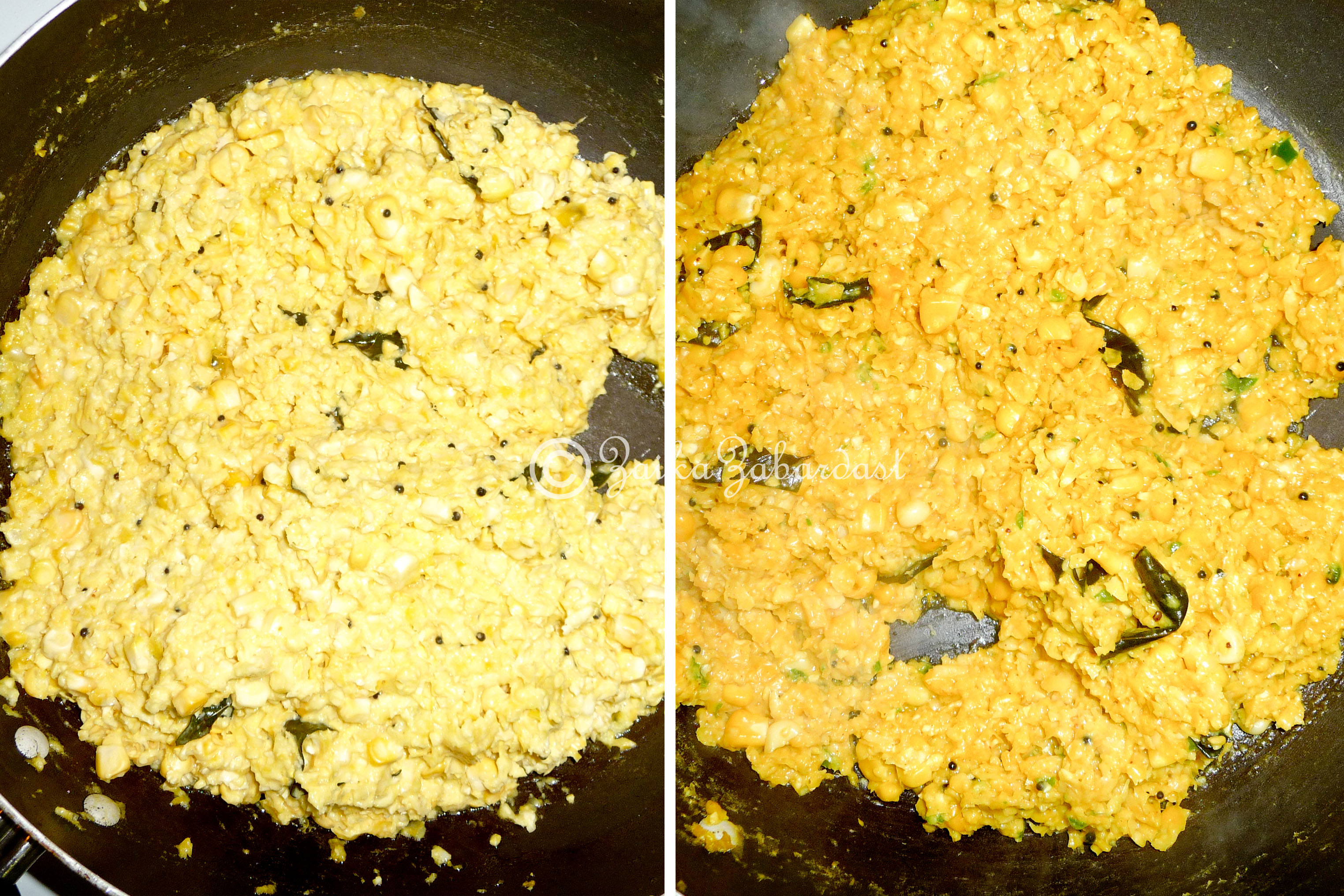 - Heat ghee/oil in a pan and add mustard seeds to it. Once they finish crackling add curry leaves and a pinch of hing. Wait for 15 seconds, and then add the corn mixture along with chili and ginger paste. Stir and cook on low heat for about 10 minutes. Make sure that the mixture doesn’t stick to the bottom of the pan.