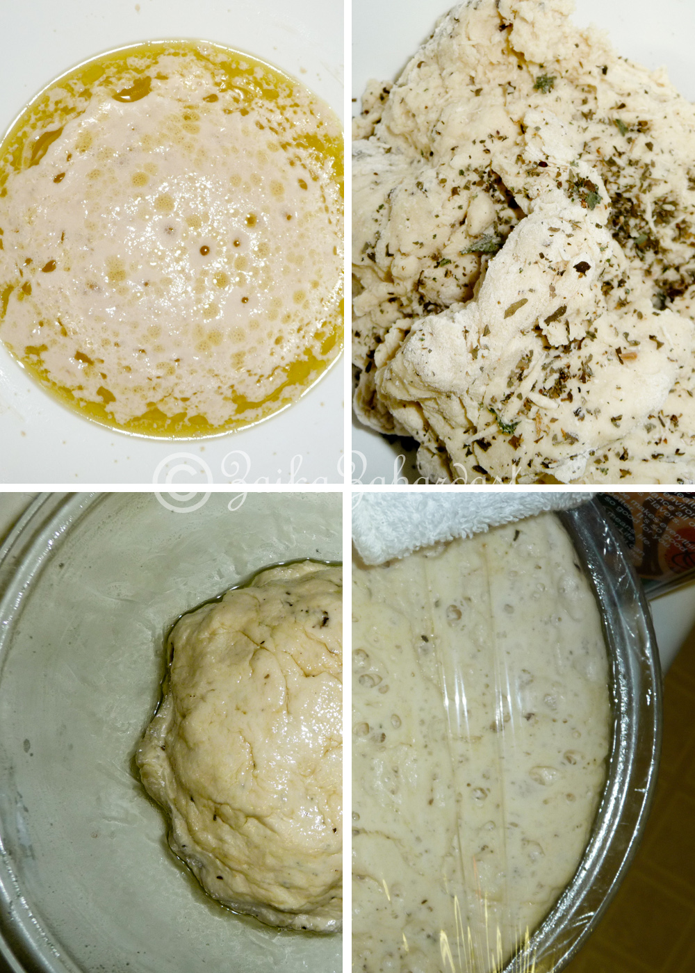 - Side by side, in a large bowl mix 2 cups of flour, baking soda, salt and baking powder. Add yeast mixture. Stir gently with a wooden spoon and mix well. Make sure there are no lumps. Now add basil leaves and rest of ¼ cup of flour if needed. Gently knead the dough in to a ball. Now coat the dough well with olive oil and put it in a bowl which is also greased with olive oil. Cover with cling film. Allow to rise for 1.5 – 2 hours in warm place.