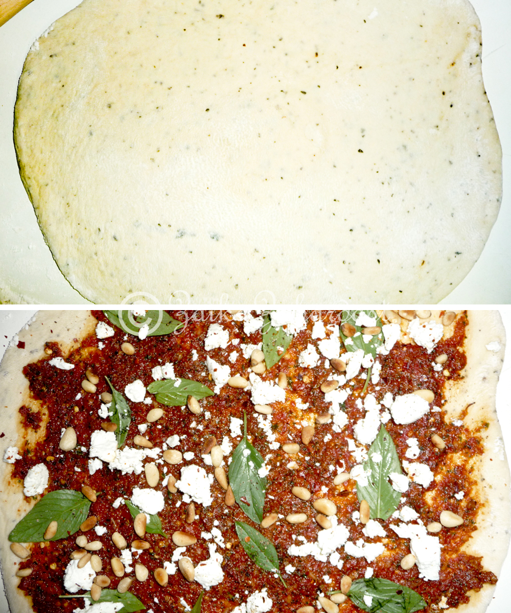 - Gently knead the dough again and cut it in the half. Roll out on a lightly floured surface into a rectangle/oblong shape (About 1/4” thick). Once rolled, spread sun dried tomato pesto leaving about half an inch of the sides. Sprinkle with some goat cheese, toasted pine nuts n basil leaves. Just like you decorate your pizza.