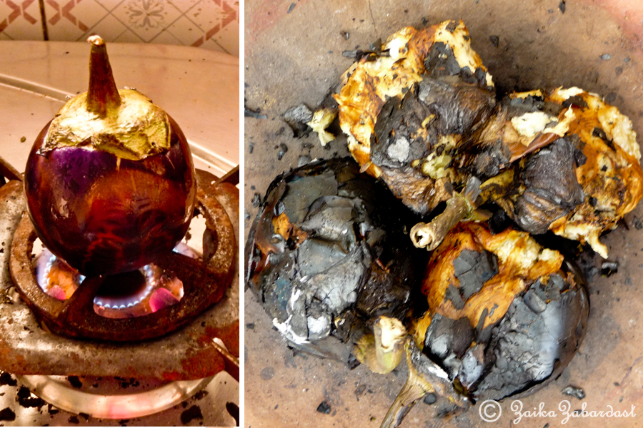 - Once roasted, remove from flame/oven and let it cool down a bit before you peel off the burnt skin and remove the stem of the eggplant.