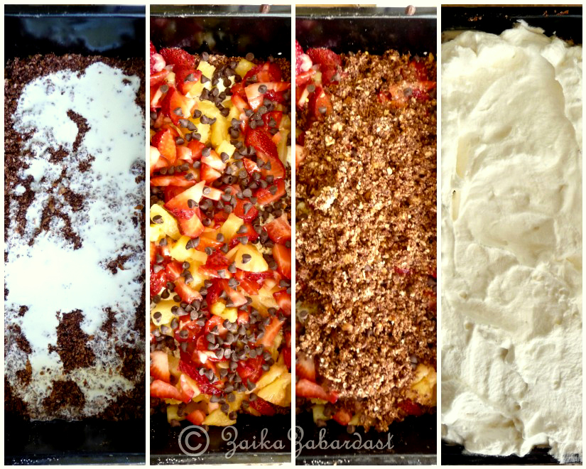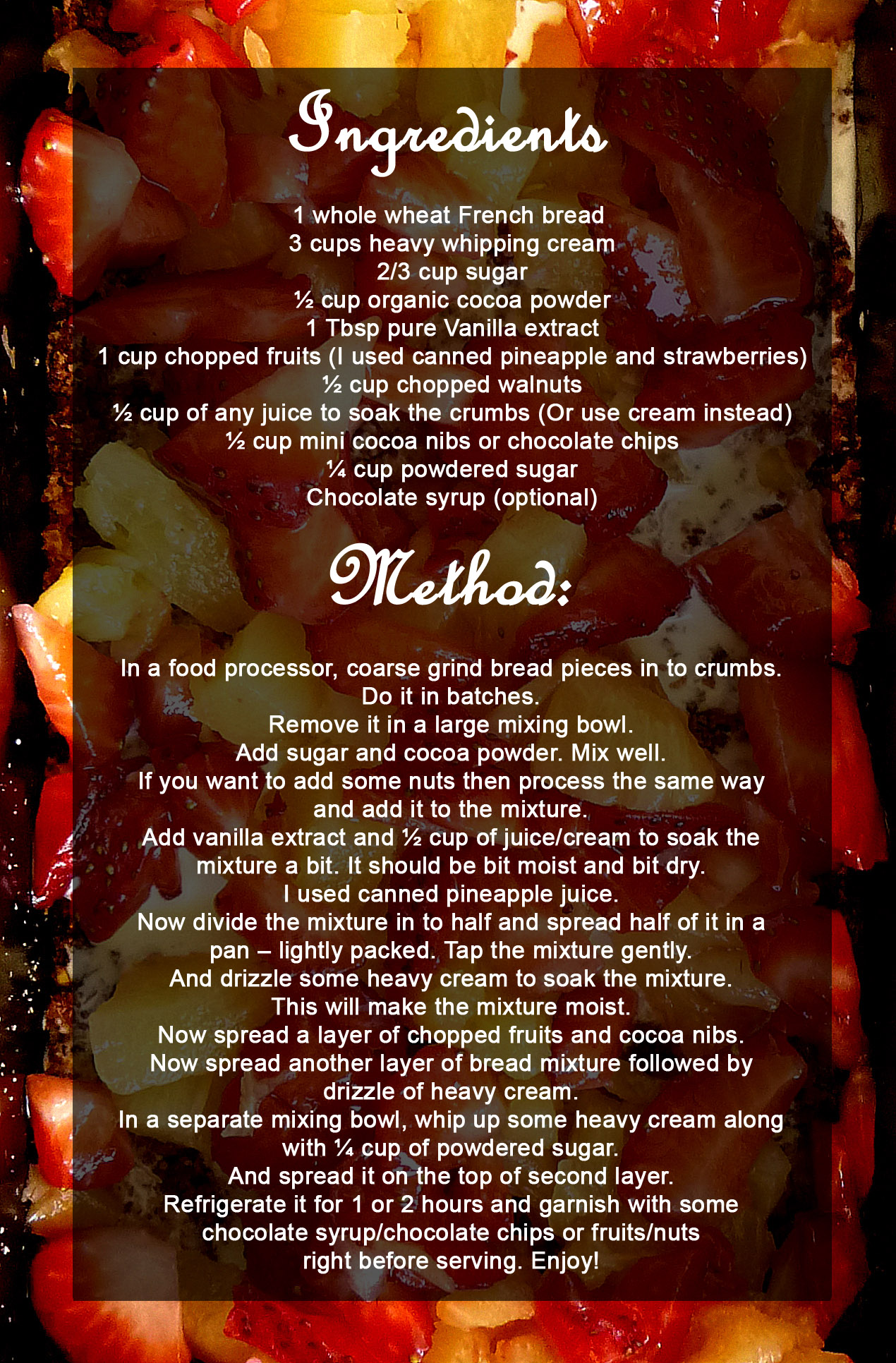 All you need to make this delicious pudding is a whole wheat French bread, heavy whipping cream, vanilla, fruits, sugar and cocoa powder. And nuts are optional. So here you go!